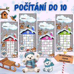 Materiál na téma tučňáci slouží k procvičení zrakového vnímání a počítání. Obsahuje 32 kartiček. Strany s kartičkami