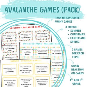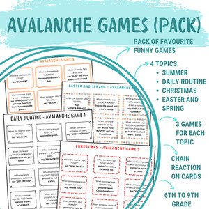 Balíček 6 her oblíbené zábavné aktivity Avalanche game, kde každá kartička s pokynem spustí další akci, jako lavina na
