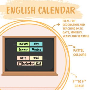Anglický kalendář ideální pro výuku dat, dnů, měsíců, roků a ročních období. Vhodné i jako výzdoba třídy pro vyšší