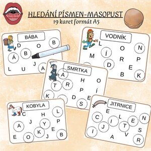 Soubor obsahuje 19 karet s masopustními obrázky a jejich názvy. Děti mají za úkol zakroužkovat smazací fixou písmena tak