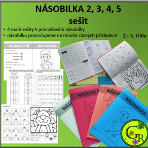 Čtyři malé procvičovací sešitky na násobilku 2 - 5. Každá knížečka má jeden list jako obal a dva oboustranné listy plné