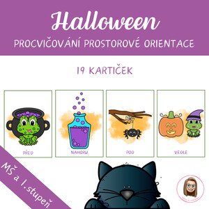Zábavná sada obrázkových kartiček s halloweenskou tematikou, která dětem pomáhá rozvíjet prostorovou orientaci a řečové
