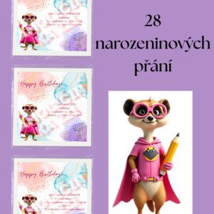Co materiál obsahuje: 28 originálních narozeninových přání se surikatou v roli superhrdinky Každé přání má jedinečný