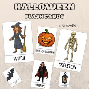 Soubor obsahuje: 31 flashcards na téma Halloween (witch, skeleton, vampire, werewolf, ghost, tomb, mummy, jack-o’