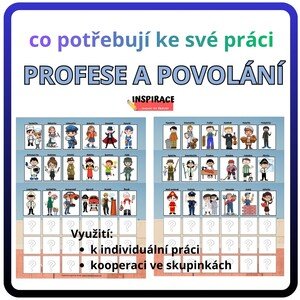 PROFESE A POVOLÁNÍ (co potřebují ke své práci) Materiál obsahuje 6 HLAVNÍCH HRACÍCH (přiřazovacích) KARET A4 . Na každé
