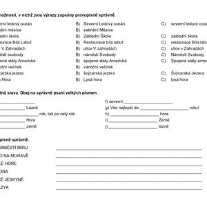 Žáci plní různé úkoly týkající se velkých písmen. Materiál obsahuje celkem tři typy zadání: přepis podle pravopisné