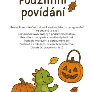 Soubor Podzimní povídání přináší hravé nápady, obrázkové materiály a hotové pracovní listy pro děti v MŠ (3–6 let). Vše
