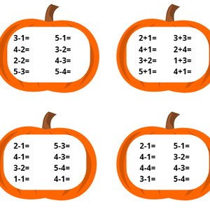 Soubor pro halloweenské počítání do 5, 10 obsahuje dvě dýně s příklady, jednu stránku s výsledky a jednu stránku s