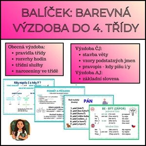 Tento soubor obsahuje 77 stránek plakátku pro výzdobu do 4. třídy: obecnou, do českého jazyka a do angličtiny (velikosti
