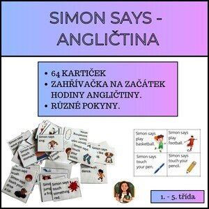 Tento soubor obsahuje 64 kartiček na rozehřátí do hodiny angličtiny. Učitel čte pokyny - pokud přečte i Simon says, žáci