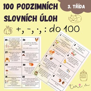soubor obsahuje: 100 slovních úloh s podzimní tematikou, úlohy na sčítání, odčítání, násobení a dělení do 100, řešení se