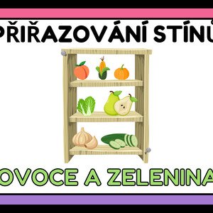 Děti mají za úkol přiřadit barevné obrázky ovoce a zeleniny k jejich správným stínům. Každý stín je položený na poličce