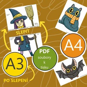 Puzzle – Halloween (pro děti 4+) Sada obsahuje 12 dvoudílných puzzle kartiček s veselými halloweenskými postavičkami