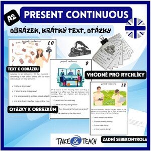 Procvičte s žáky přítomný čas průběhový na situačních kartičkách s krátkým příběhem s doplňujícími otázkami a odpověďmi