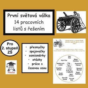 Pracovní listy s názvem První světová válka obsahují úvodní stránku, 14 pracovních listů a řešení pro učitele. Listy