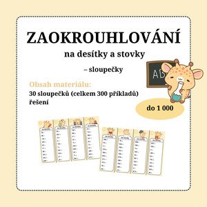 Sloupečky na procvičování zaokrouhlování čísel do 1 000 na desítky a stovky v motivu žiraf. Obsah materiálu: 24