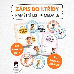 Set k vlastnímu vytištění k příležitosti zápisu do 1. třídy - pamětní listy jsou univerzální, medaile pro rok 2026/2027