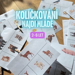 Kolíčkovací aktivita zaměřená na přiřazování mláďat k jejich maminkám. Materiál je diferencovaný – jednoduché varianty