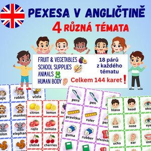 Dvojjazyčná pexesa v angličtině. 🐰🍎✏️ V souboru naleznete pexesa na 4 různá témata: 🐭Animals – zvířátka 🍏 Fruit and