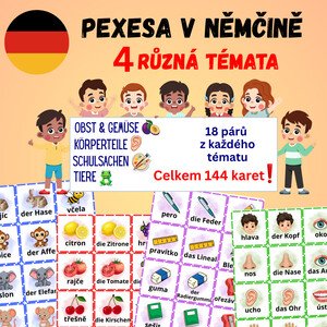 Dvojjazyčná pexesa v němčině. 🐰🍎✏️ V souboru naleznete pexesa na 4 různá témata: 🐭 Tiere – zvířátka 🍏 Obst und Gemüse –