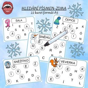 Soubor obsahuje 22 karet se zimními obrázky a jejich názvy. Děti mají za úkol zakroužkovat smazací fixou písmena tak