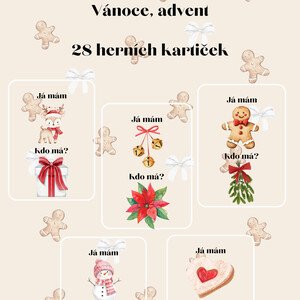 Soubor obsahuje 28 herních kartiček s vánočními, adventními obrázky. Popis hry: Rozdáme karty mezi děti (někdo může mít