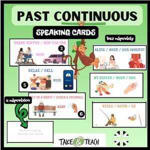 Procvičte s žáky minulý čas průběhový v kombinaci s minulým časem prostým v obrázkových kartičkách s nápovědou i bez