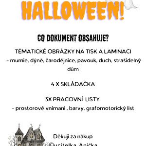 Soubor s materiály pro téma HALLOWEEN obsahuje: TÉMATICKÉ OBRÁZKY NA TISK A LAMINACI - mumie, dýně, čarodějnice, pavouk