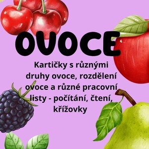 OVOCE - pracovní listy - křížovka, počítání, čtení, ovocné sudoku. Kartičky s různými druhy ovoce.