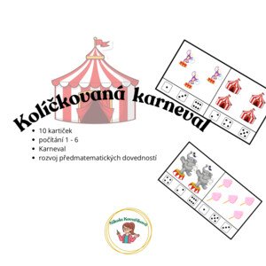 Úkoly ke karnevalu v MŠ. Na 14 stránkách najdete: 8x půlené obrázky PL - počítání a zapisování počtu 8x kolíčkování s