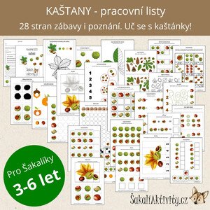 Soubor Pracovní listy Kaštany nabízí 28 stran plných vzdělávacích a hravých aktivit pro děti předškolního a mladšího