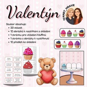 Soubor aktivit na téma Valentýn. Otázky, puzzle, podkladový obrázek pro skládání muffinů. Otázky jsou vhodné do ranního