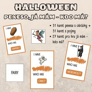Pexeso obsahuje 30 obrázků s halloweenskou tematikou. Cílem hry je najít co nejvyšší počet obrázkových dvojic. Karty se