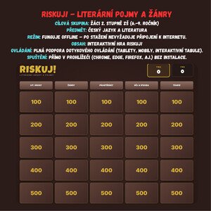 Riskuj! – Literární pojmy a žánry Tato aktivita je digitální vzdělávací hra typu soutěžního kvízu, která je vytvořena ve