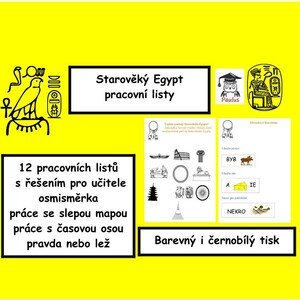 Pracovní listy s názvem Starověký Egypt obsahují úvodní stránku, 12 pracovních listů a řešení pro učitele. Listy mimo