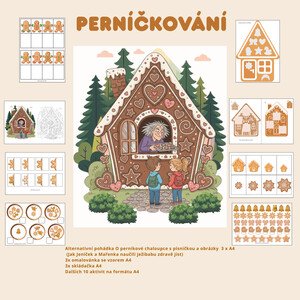 Tento soubor obsahuje alternativní pohádku O perníkové chaloupce s písničkou, demonstračními obrázky, omalovánkami a