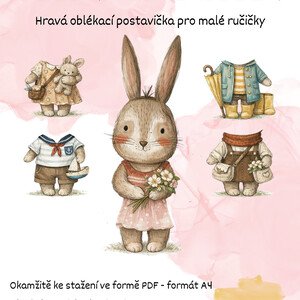 Oblékací zajíček – hravá aktivita pro malé ručičky Materiál obsahuje oblékací postavičku zajíčka a 12 různých oblečků