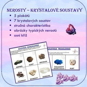 Materiál názorně představuje základní krystalové soustavy nerostů. Jsou v něm zobrazeny typické minerály přiřazené ke