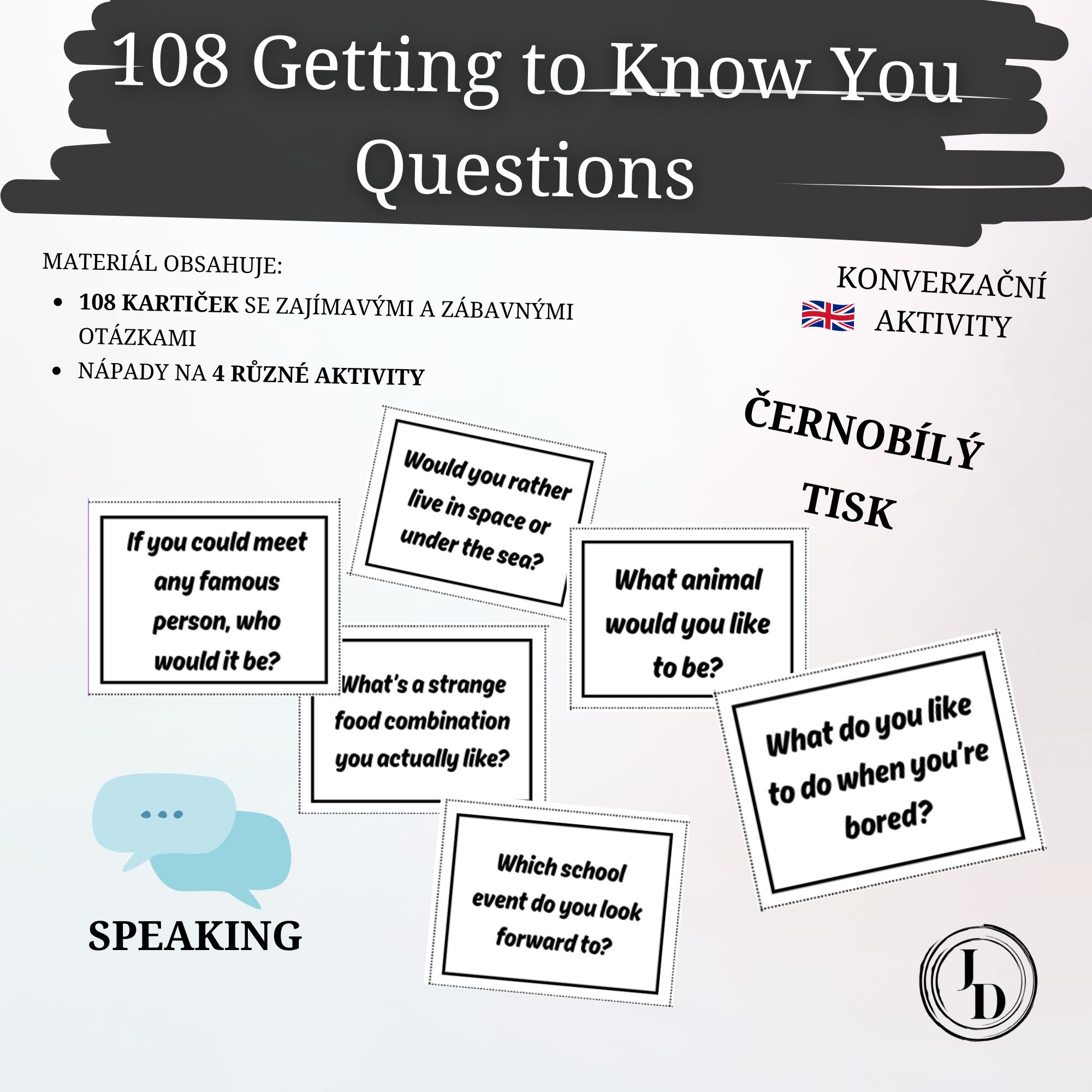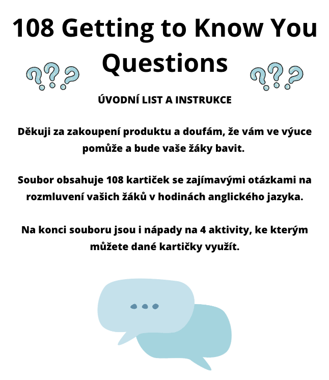 Soubor obsahuje 108 kartiček se zajímavými otázkami na rozmluvení vašich žáků v hodinách anglického jazyka.