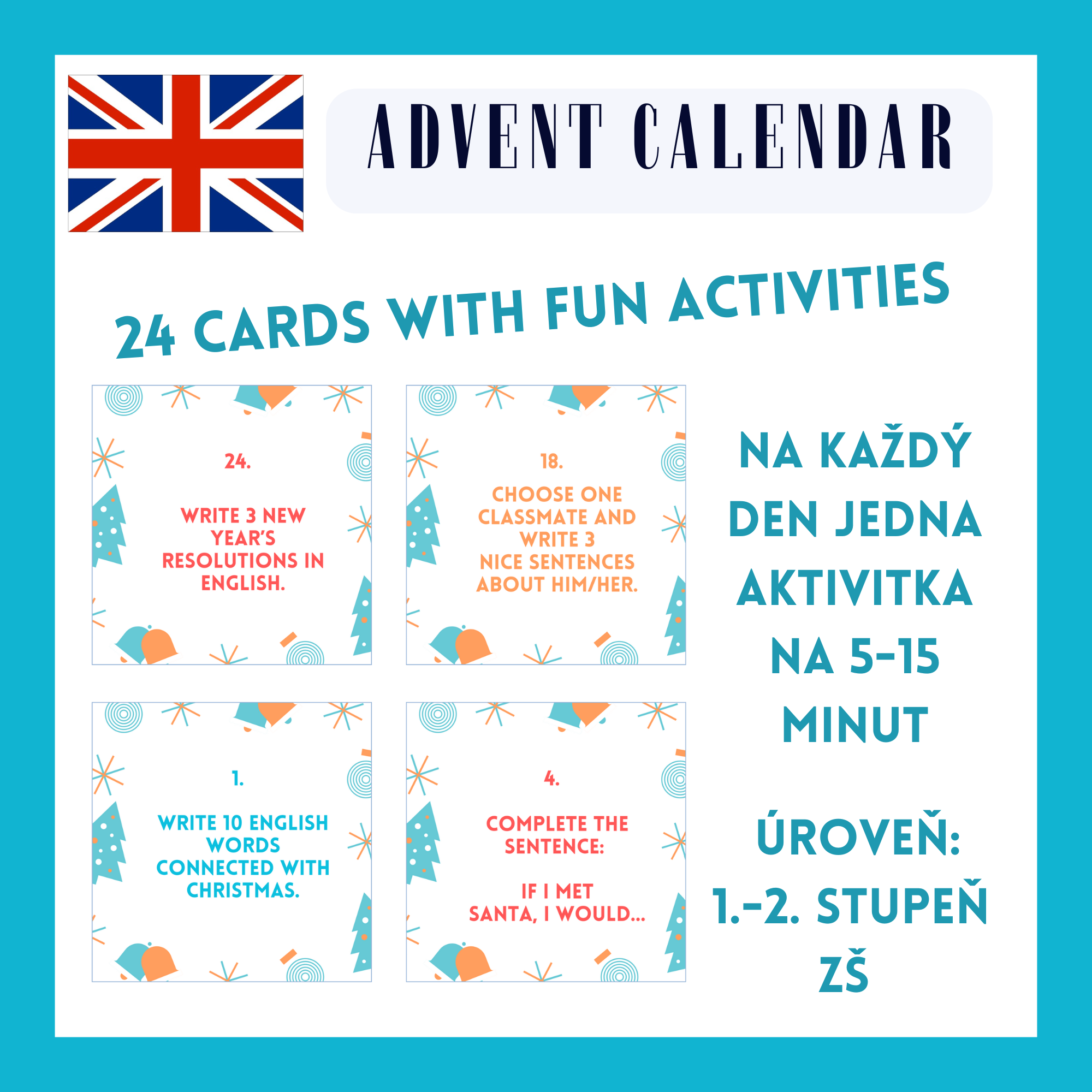 Kalendář kombinuje všechny rozvíjené dovednosti jako je čtení, psaní, mluvení, gramatiku a kreativní aktivity. Úkoly jsou krátké, hravé a tematicky propojené s vánocemi.
