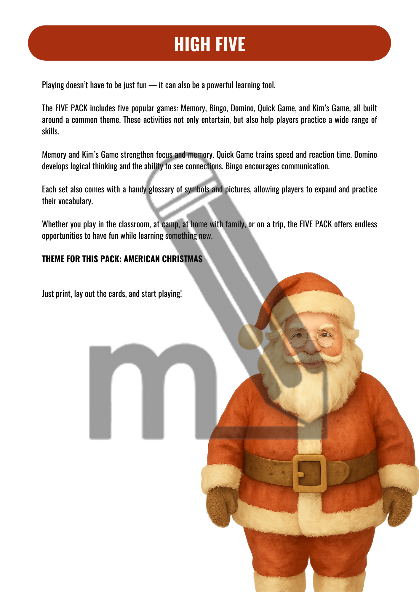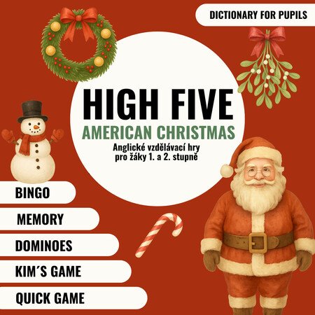 Balíček HIGH FIVE - AMERICAN CHRISTMAS promění výuku angličtiny v zábavné dobrodružství plné vánoční atmosféry. Téma dětem otevírá dveře do světa amerických svátků. Díky tomu mohou žáci o Vánocích nejen mluvit, ale také porovnávat české a americké tradice a přitom si nenásilně osvojovat nová anglická slovíčka.