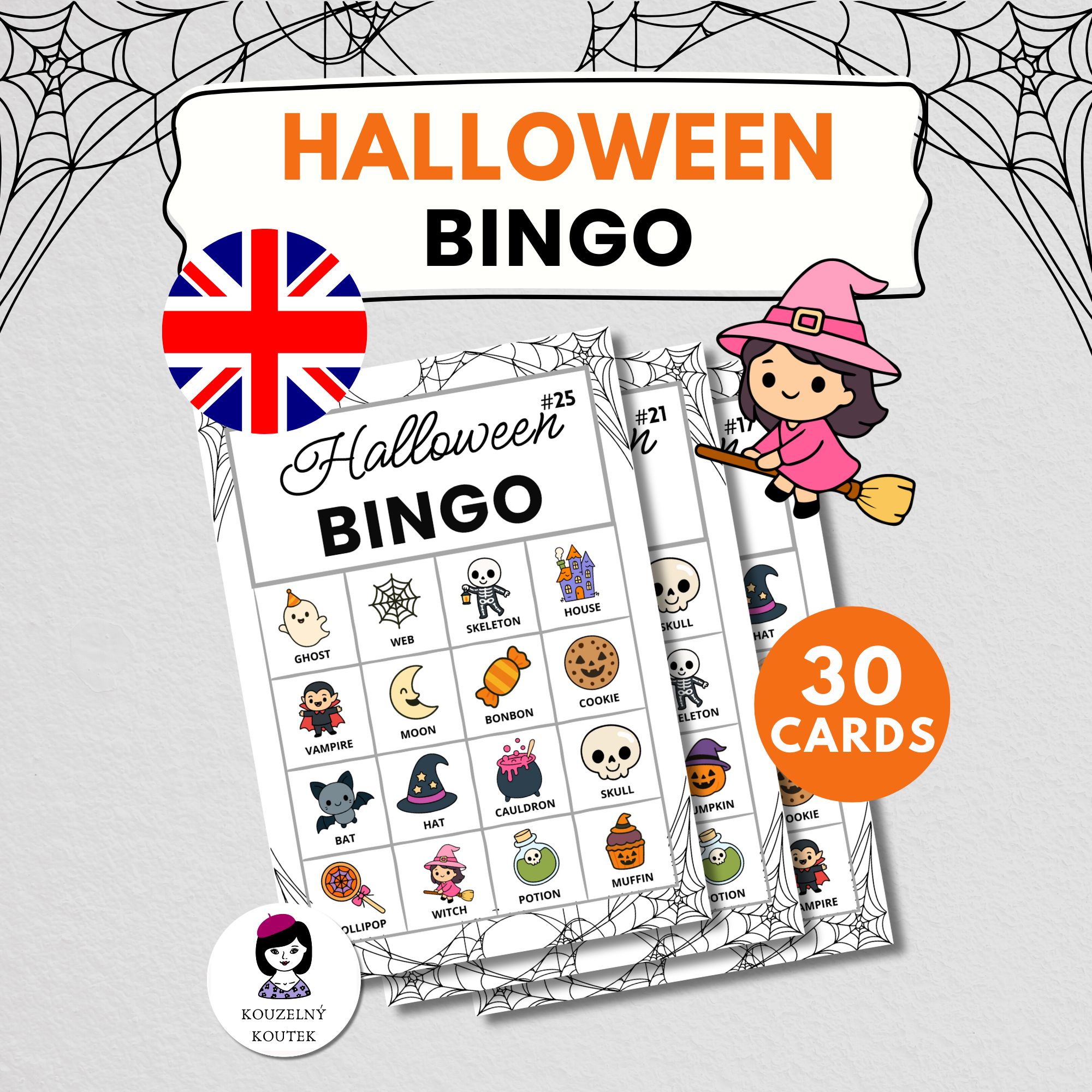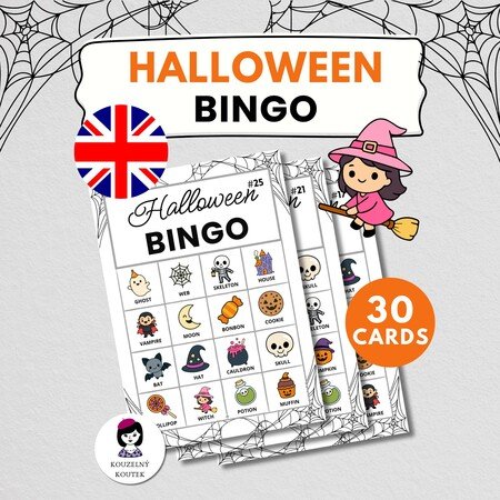 Anglické hallowenské bingo pro děti je zjednodušená verze tradiční hry bingo, která je navržena tak, aby byla zábavná a přístupná pro děti.