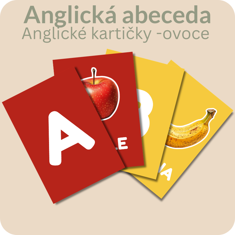 Sada kartiček pro hravé seznámení dětí s anglickou abecedou a základní slovní zásobou. Materiál obsahuje písmena anglické abecedy doplněná o obrázky a anglická slova, která na dané písmeno začínají (např. A – Apple, B – Banana).