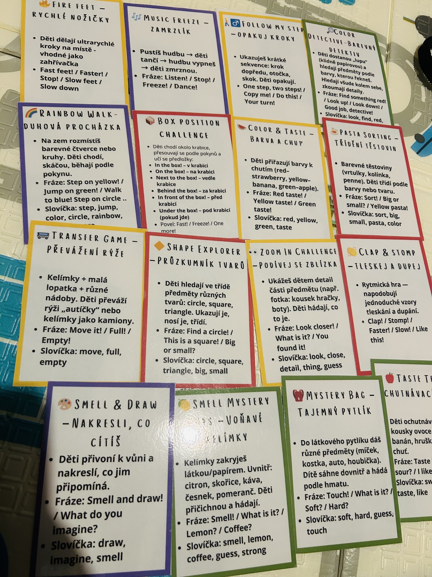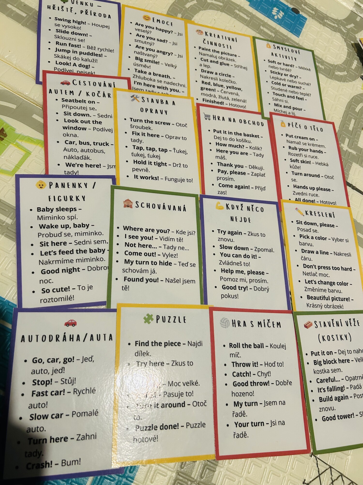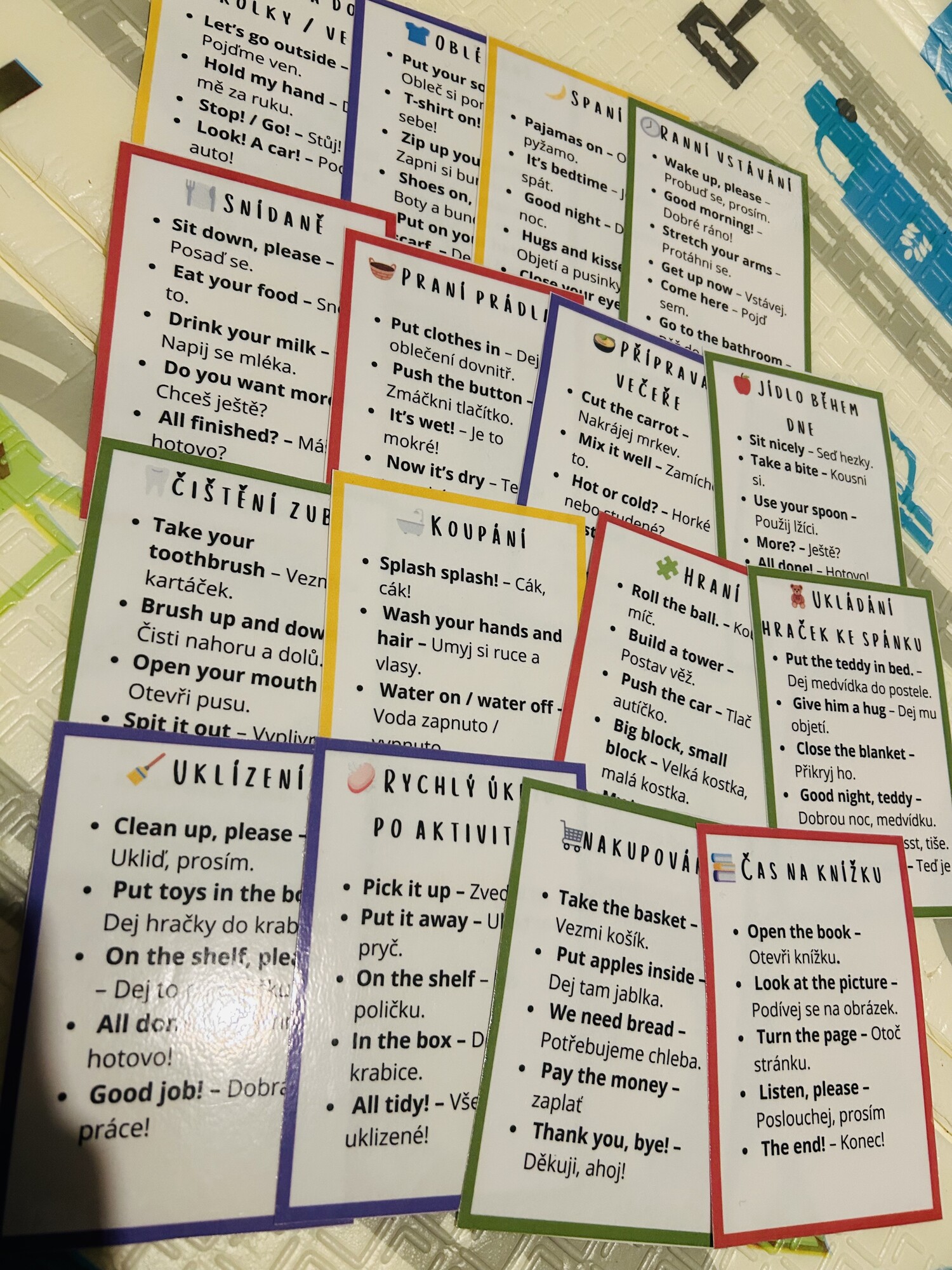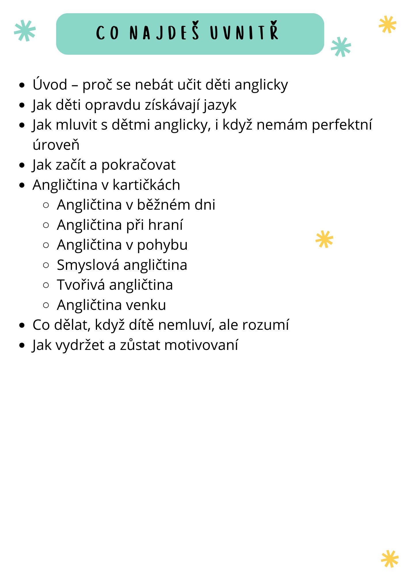 Tahle kniha ti dá krátké věty, rychlé aktivity a přesné fráze, které použiješ doma, venku, při jídle, ve vaně — všude, kde máš dítě po ruce.
