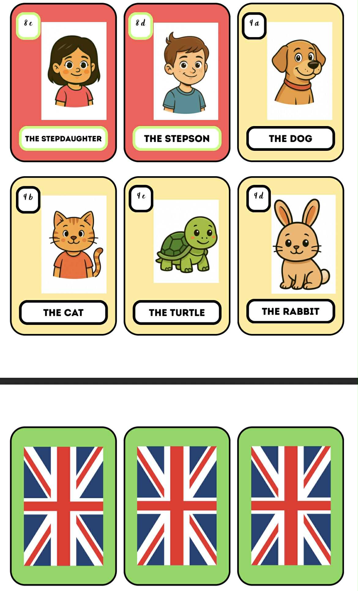 V souboru je 8 stran s kartičkami. Na každé straně je 9 karet do kvarteta. Kartičky mají k sobě i rubovou stranu