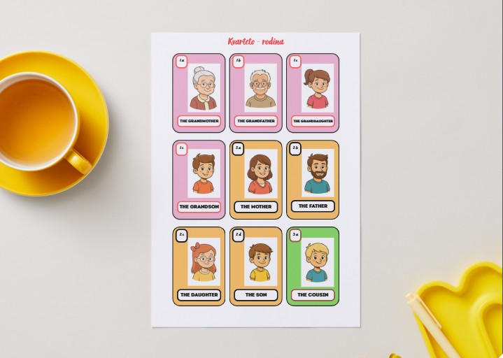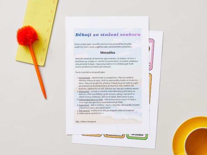 V souboru najdete celkem 36 karet pro karetní hru Kvarteto. Kartičky jsou přizpůsobené pro znázornění rodinných vazeb a k upevnění slovní zásoby. Na každé stránce se nachází celkem 9 karet a následující strana obsahuje zadní strany karet pro natištění. Doporučuji vytisknout oboustranně či následně slepit. Možnou vhodnou variantou je vytisknout na silnější papír, aby nedocházelo k průhlednosti. Z toho důvodu jsou kartičky zadních stran tmavších barev. Úvodní stránka obsahuje metodická doporučení a možné další varianty her a využití karet nejen pro hru Kvarteto.