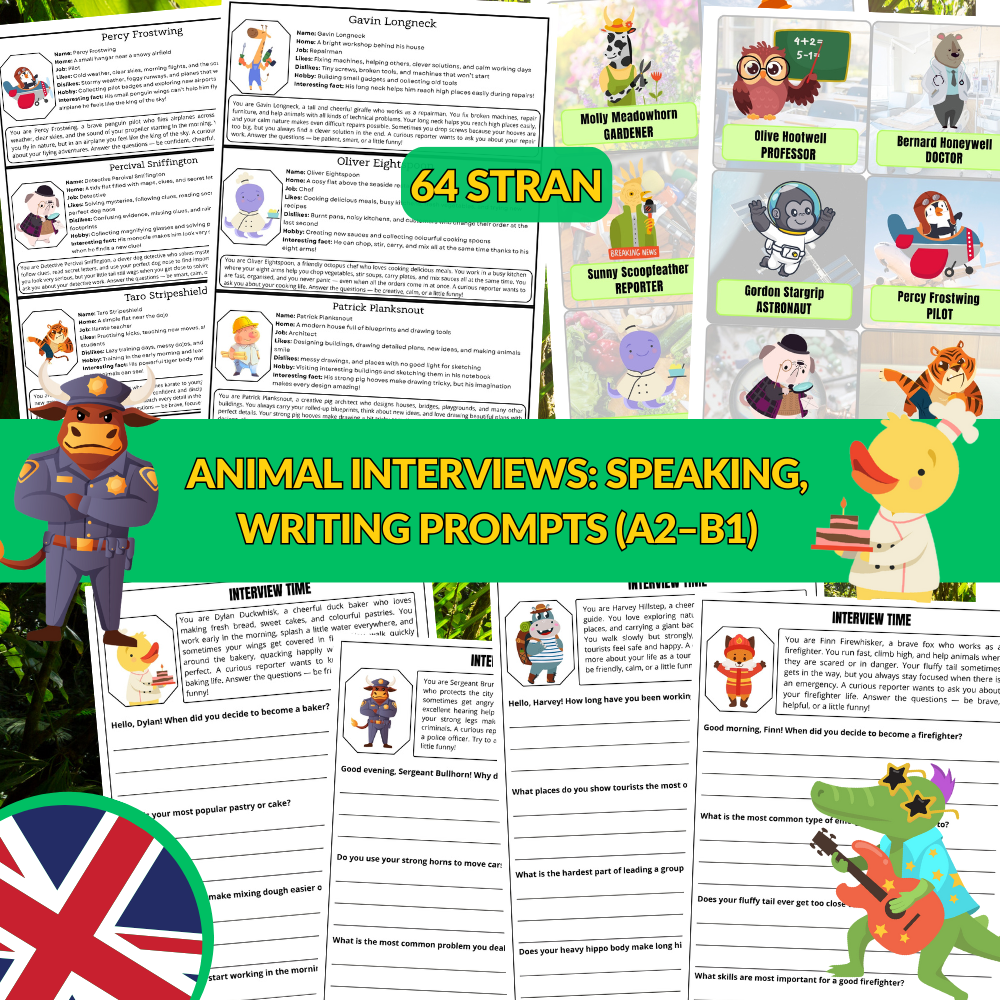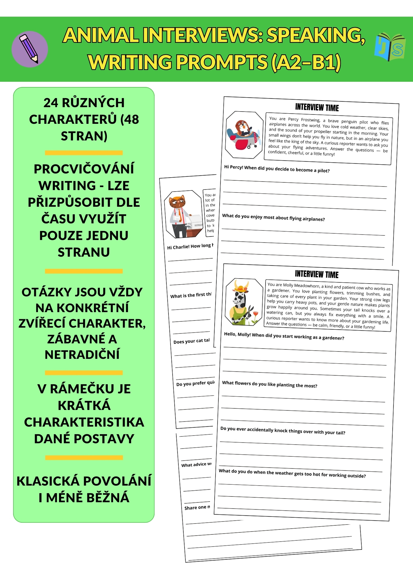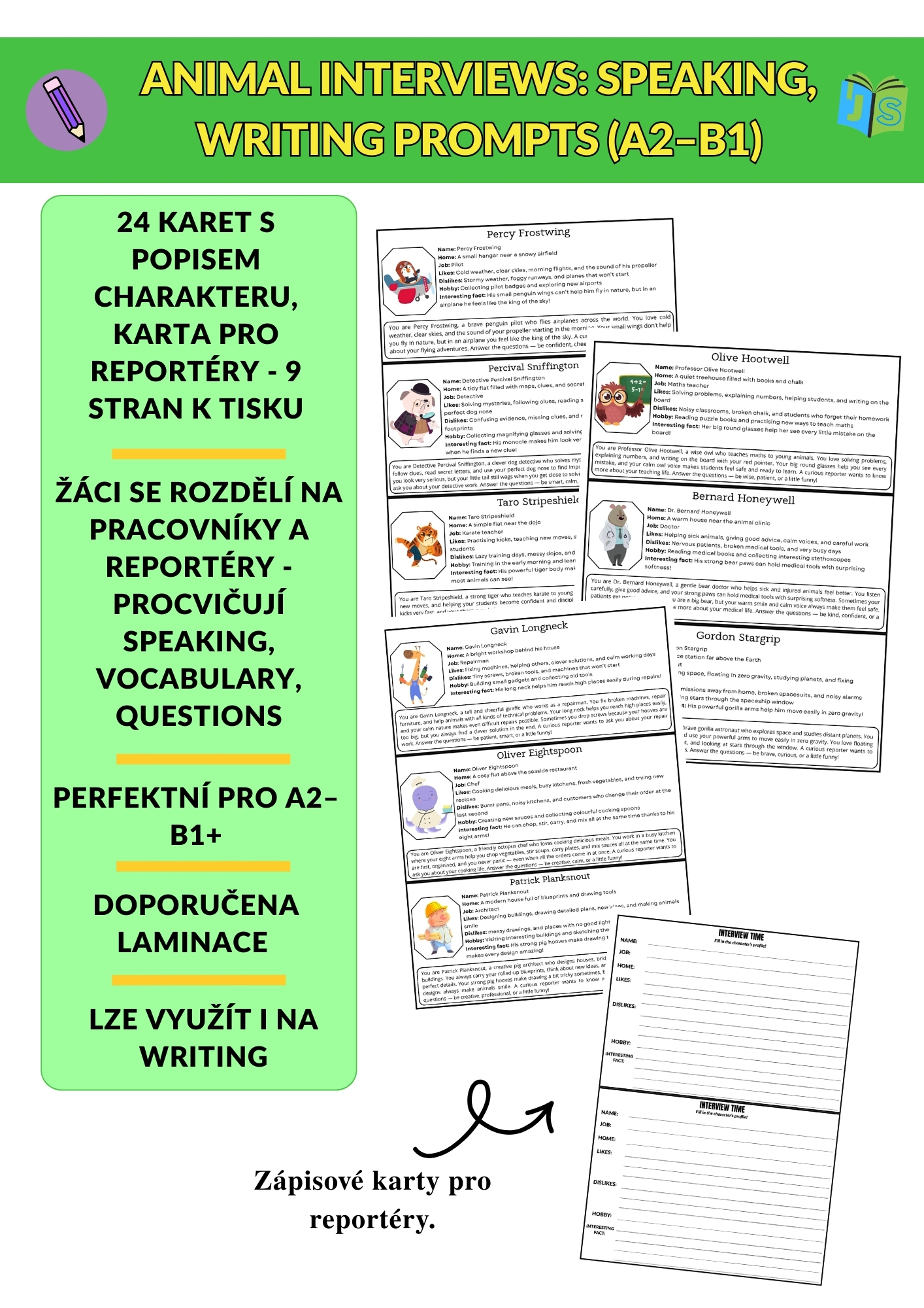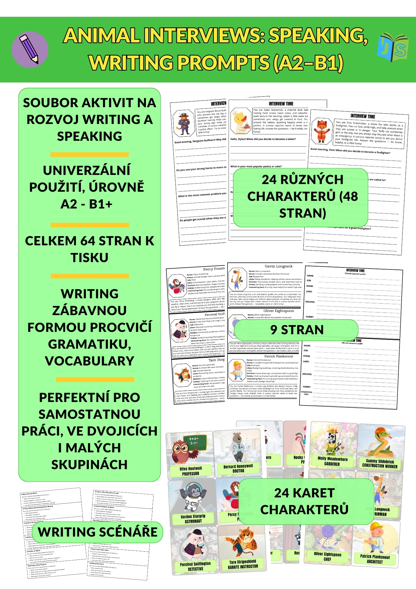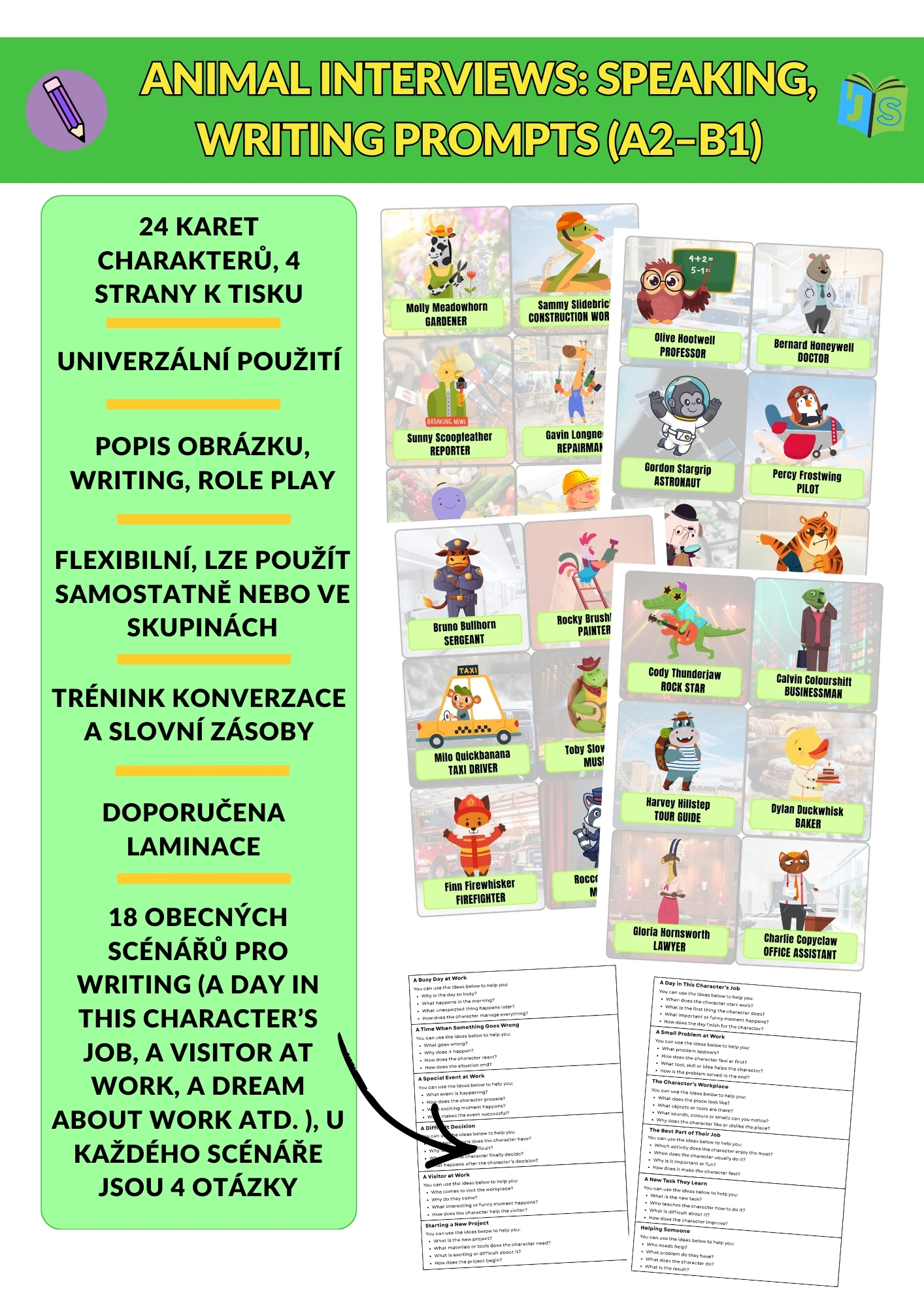 Tento originální soubor Animal Interviews: Speaking & Writing Prompts (A2–B1) představuje 24 zvířecích profesí, díky nimž se výuka angličtiny mění ve zábavné rozhovory, role-play a kreativní psaní. Žáci se stávají reportéry, herci i autory vlastních textů – procvičí speaking, writing, slovní zásobu i kreativní vyjadřování.
