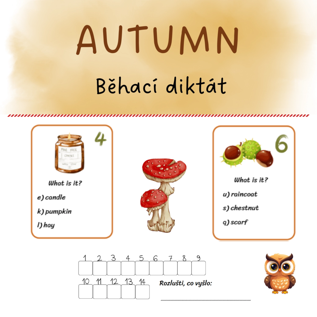 Běhací diktát na téma Autumn, včetně záznamového archu. Aktivita je vhodná pro výuku angličtiny, rozvíjí slovní zásobu, čtení, psaní i pohyb.