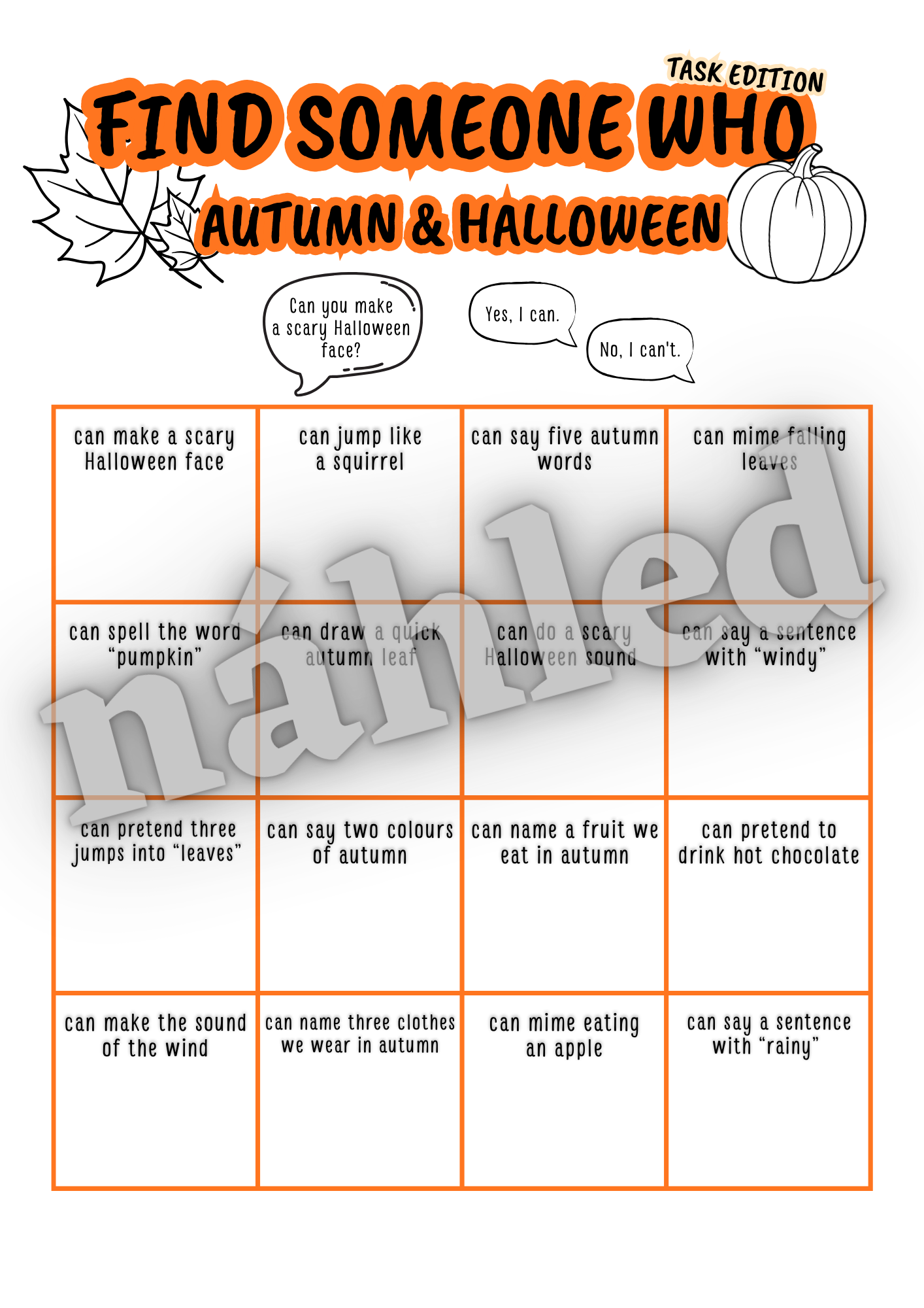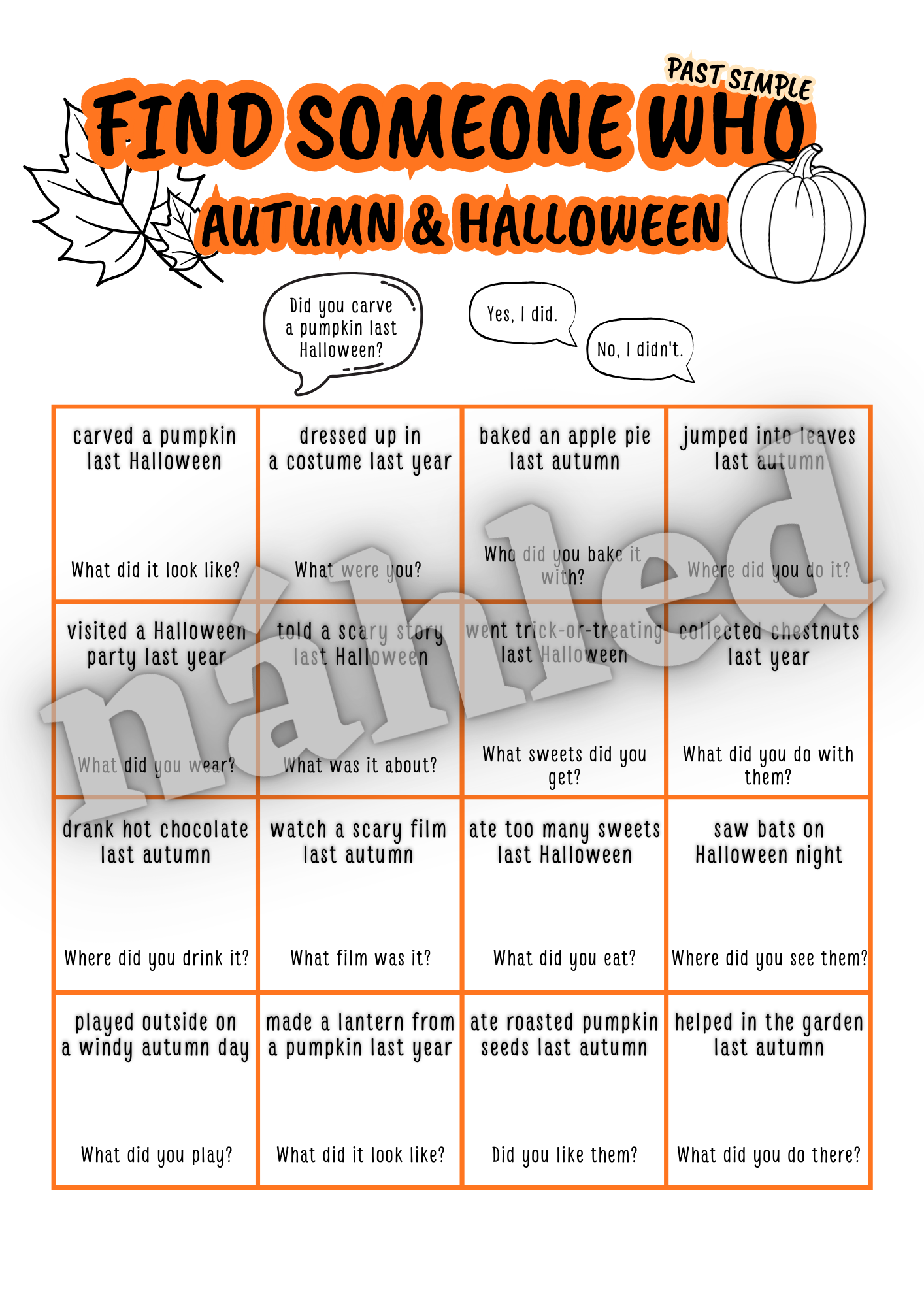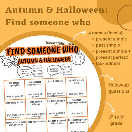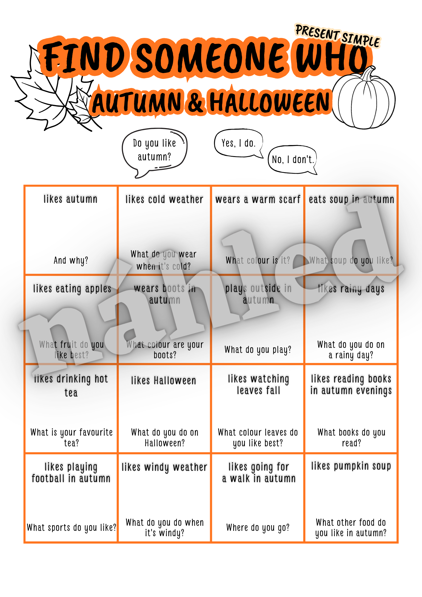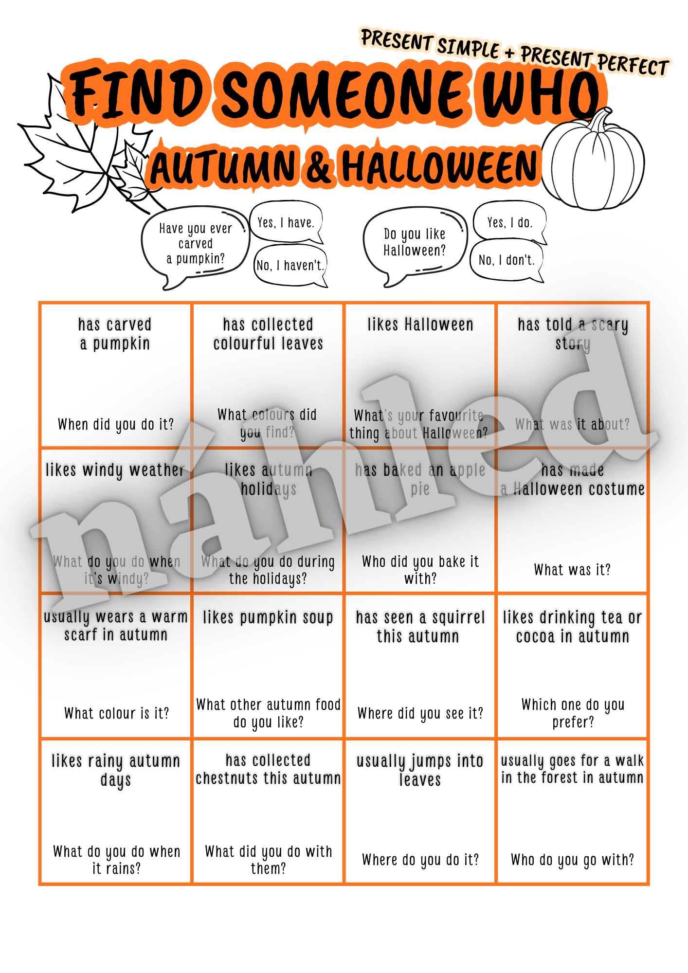 Konverzační aktivita Find someone who... zaměřená na procvičování slovní zásoby na téma Autumn a Halloween. Aktivita obsahuje navazující otázky, aby se z ní stalo více konverzační cvičení a ne jen “Yes/No game”.