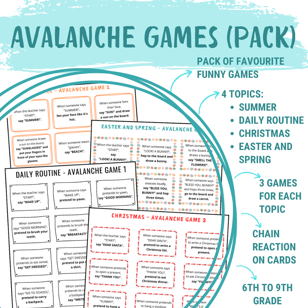 Balíček 12 her oblíbené zábavné aktivity Avalanche game, kde každá kartička s pokynem spustí další akci, jako lavina na horách. Ideální na procvičení slovní zásoby a poslechu v zábavné řetězové reakci.